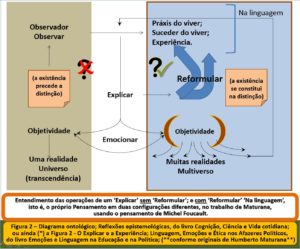 Ainda no tópico 1. O traçado da rota a percorrer, veio de Humberto Maturana. Tomei a pedra fundamental de seu pensamento, as objeções e propostas que ele fez sobre como eram e como deveriam ser, os modelos para fenômenos, inspirados na biologia; está em De máquinas e de seres vivos: autopoiese, a organização do vivo; Vinte anos depois; História. De Maturana tomo também a Figura 2 – Diagrama ontológico; Reflexões epistemológicas, do livro Cognição, Ciência e Vida cotidiana; servem de inicio e de suporte para as animações.